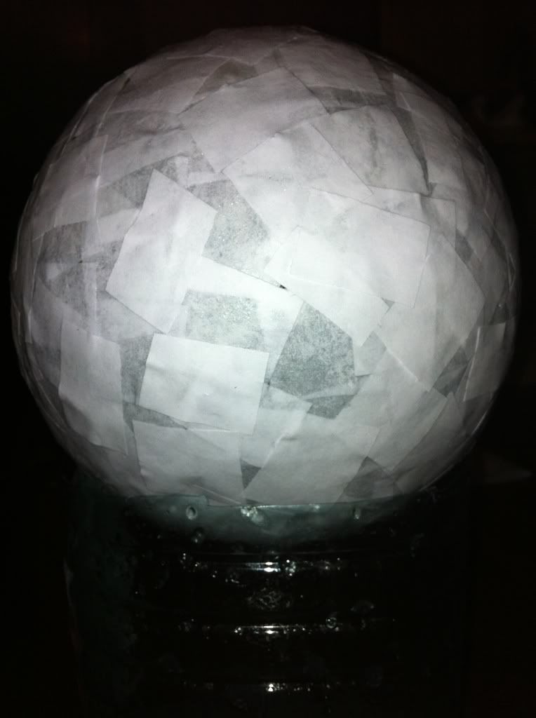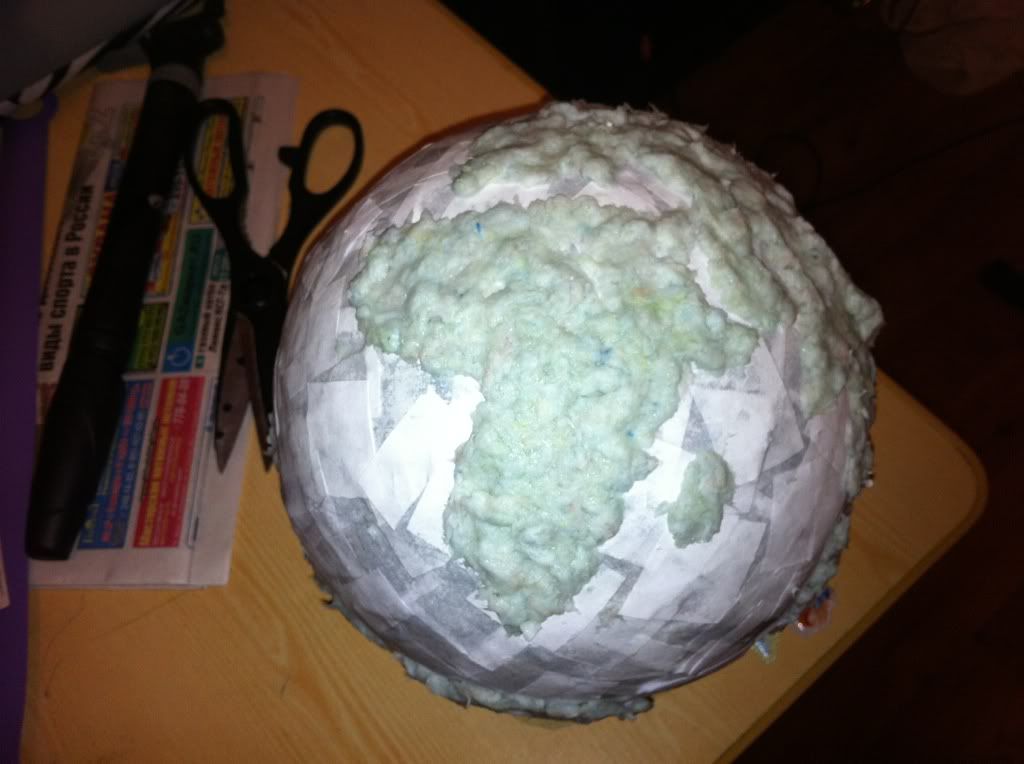 Трудозатраты - 1 день - 1,5 часа выкладки шара и материков из резаных газет и салфеточной массы. 2 день - покраска примерно час.