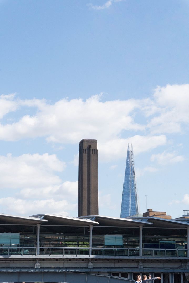 А вот и классика контрастов архитектуры Лондона. Тейт и Шард. Видавший виды кирпич против стекла.
